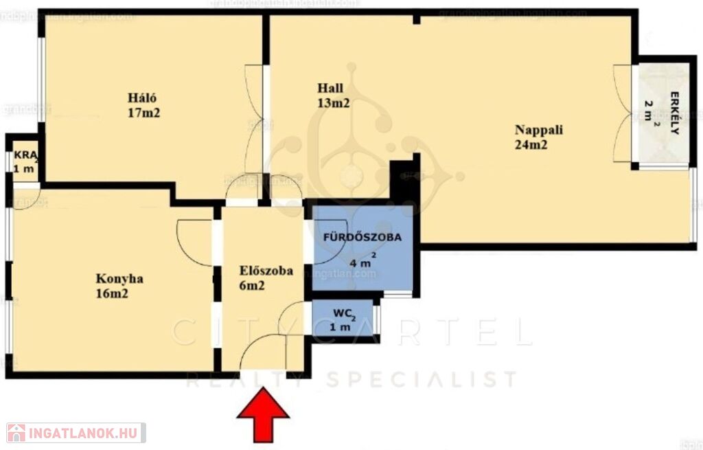 A nappali kb. 30 nm, ebből nyílik a külön bejárattal is rendelkező háló, ami kb. 16 nm.