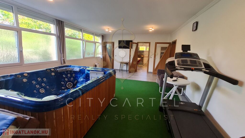 Külön épületben a garázs, tároló, modern konyha, nappali, szoba, biliárdszoba, konditerem jakuzzival, szauna két zuhanyzóval.