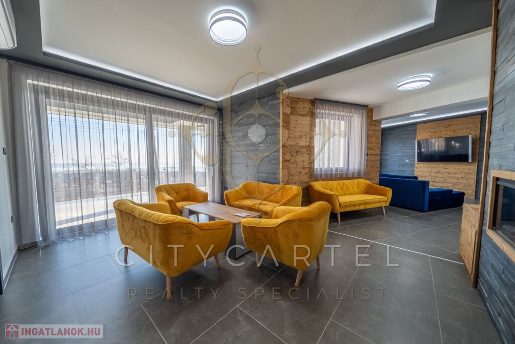 Középső szint: 60 nm-es amerikai konyhás nappali, 2 hálószoba, 2 fürdőszoba, 60 nm-es panorámás terasz,