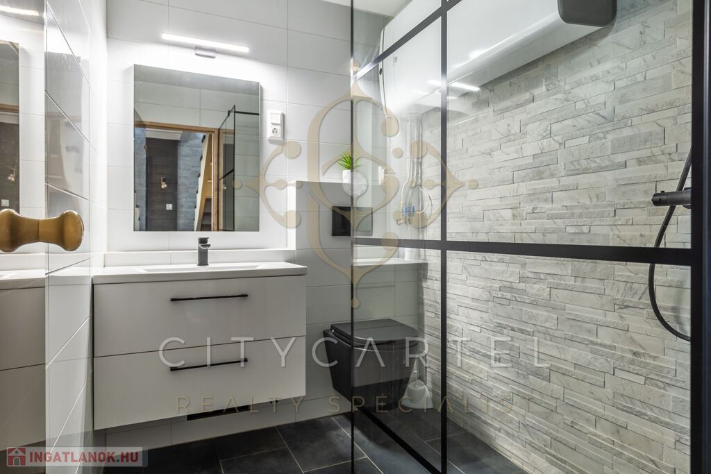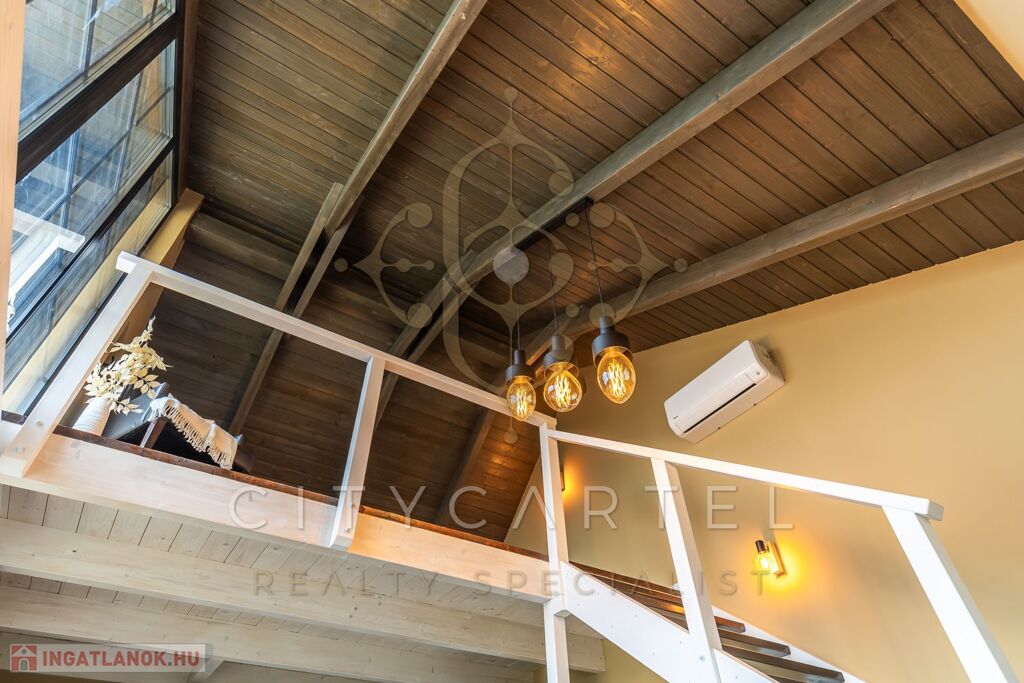 - A felső szinten egy kádas fürdőszoba, valamint egy galériás, jelenleg nyitott, de igény esetén könnyedén zárttá alakítható 34 nm-es szoba kapott helyet.