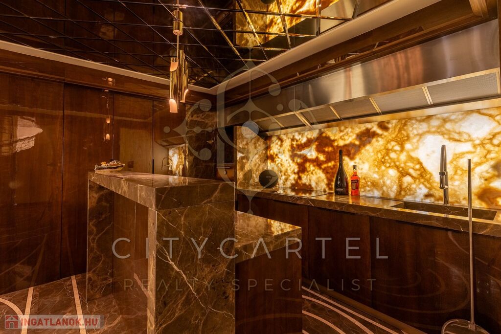 A villa minden részlete egy mestermű: a márvány, az ónix és a nemesfa harmóniája tökéletesen kiegészíti a modern technológiai megoldásokat. A reprezentatív, magas belmagasságú terekben a térérzet és a fény játéka uralkodik.