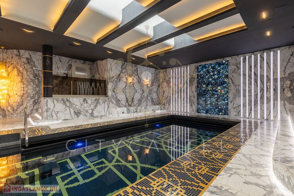 Első emelet: 18 méter hosszú medence visszahúzható üvegfedéssel, 8–10 fős jacuzzi, finn szauna, gőzkabin, kiszolgálóhelyiségek, személyzeti lakrész, modern borospince