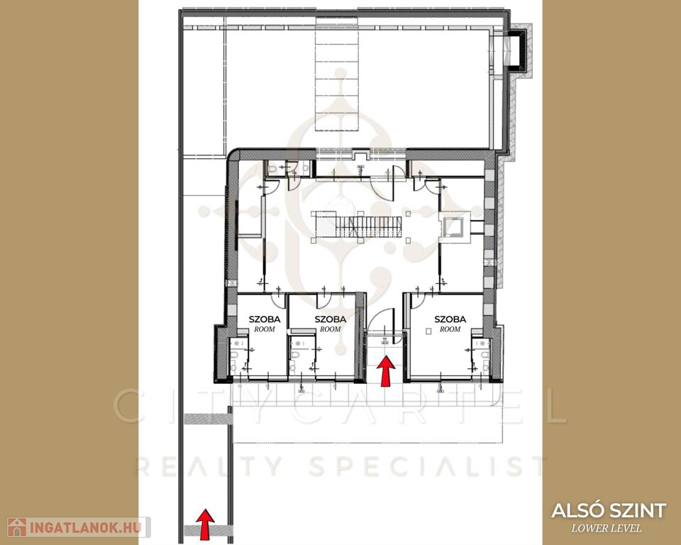 A legalsó szinten (kb 195 nm) 3 önálló szoba kapott helyet, mindhárom saját fürdőszobával és gardróbbal rendelkezik.