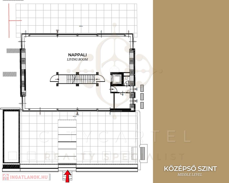 A középső szinten 170 nm-es nappali és látvány konyha kerül kialakításra egy nagy méretű háttérkonyhával, amely teljesen szeparálható a család életterétől. A nappaliból mindkét irányba hatalmas teraszok nyílnak – egyik a panorámát tárja elénk, másik a hegy felé néz a kerttel.