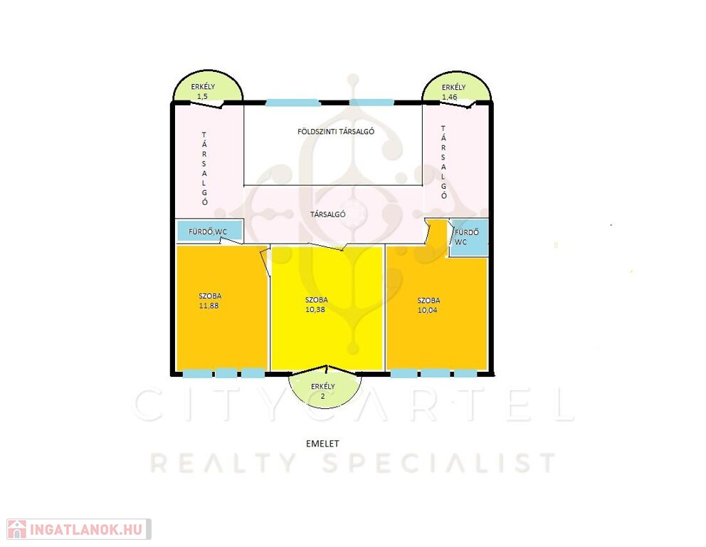 A bejárati szintről lépcső vezet föl az EMELETRE, amelynek két szélén erkélyes társalgót találunk. Az emeleten van egy kétszobás, erkélyes lakrész fürdőszobával és WC-vel valamint egy különálló szoba fürdővel és WC-vel.