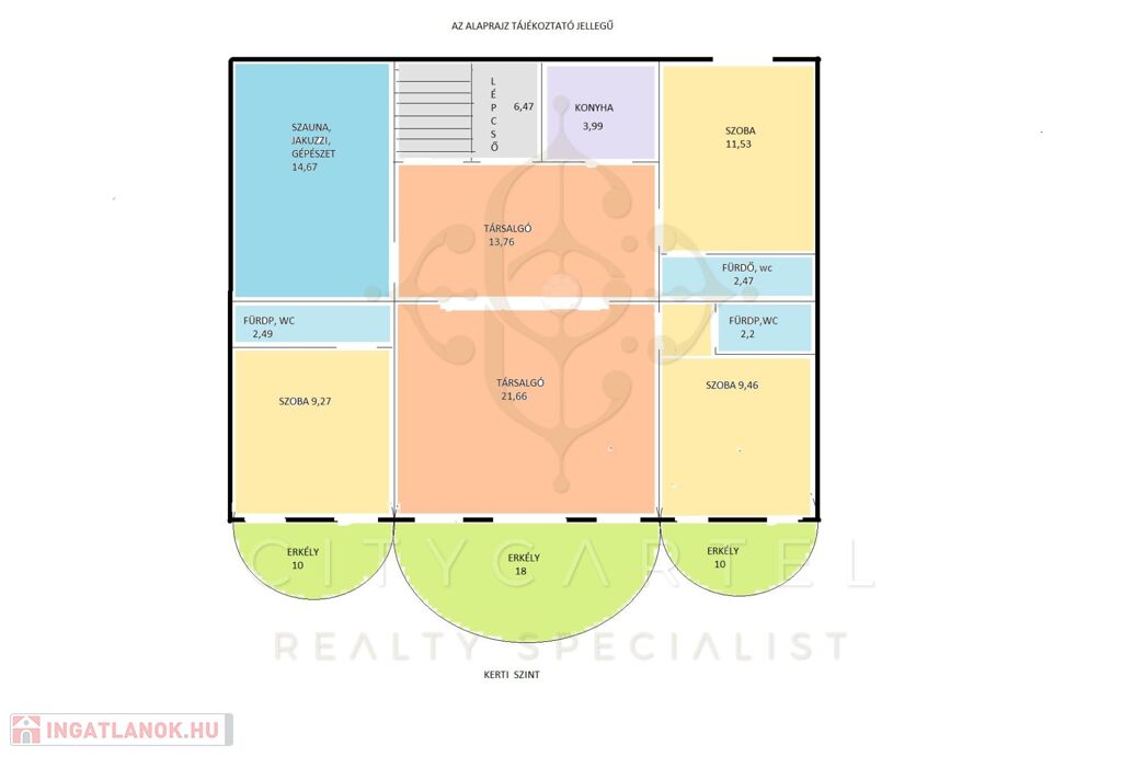 A KERTI SZINTEN a nagyméretű, erkélyes társalgóból három, külön fürdőszobával és WC-vel rendelkező, erkélyes szoba nyílik. A társalgó és a két szoba erkélyei a városra néznek. A másik társalgóból nyílik a harmadik szoba, a konyha és a wellness rész; jakuzzi, szauna, hidromasszázs kád és az ezekhez tartozó gépészet.