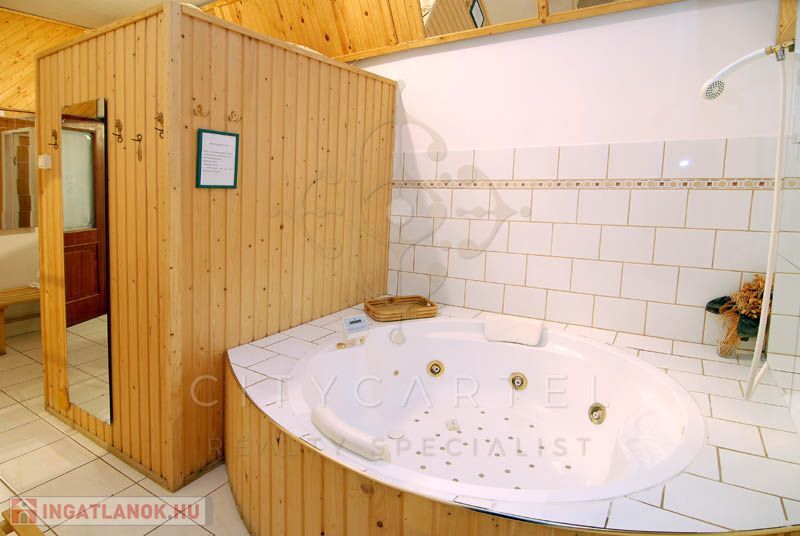A társalgó pazar hangulatát a kandallóban lobogó tűz, a hűvösebb napokon még barátságosabbá varázsolja. Ezen a szinten van még egy külön bejáratrú szoba fürdőszobával és WC-vel. Az előtérből nyílik még egy mosdó és WC, valamint a 12 négyzetméteres közlekedő oldalánál található lépcső, amely az alsó, kerti szintre vezet továbbá egy 17 négyzetméteres szoba.