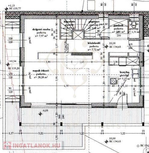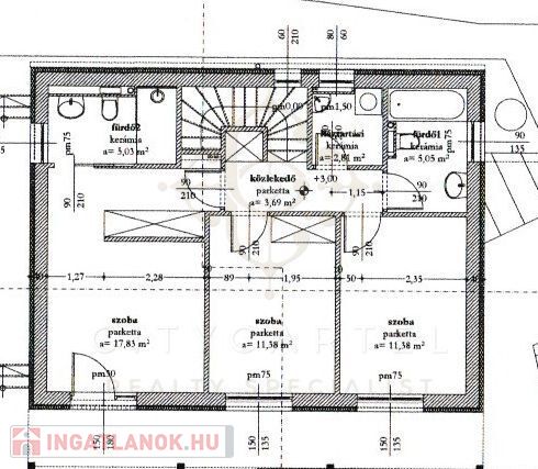 Emelet: 3 hálószoba, 2 fürdőszoba (az egyik káddal, a másik zuhanyzóval), háztartási helyiség, beépített szekrények a folyosón.