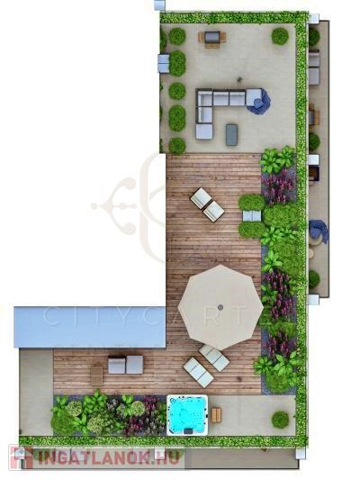 Minden lakás saját, kizárólagos használatú, déli tájolású terasszal vagy kerttel rendelkezik, kilátással a János-hegyre, gondosan megtervezett növényzettel és modern öntözőrendszerrel kerülnek átadásra. A kertekben és a teraszokon található vízvételi helyek, valamint az öntözőrendszer gondoskodik növényei egészségéről és szépségéről.