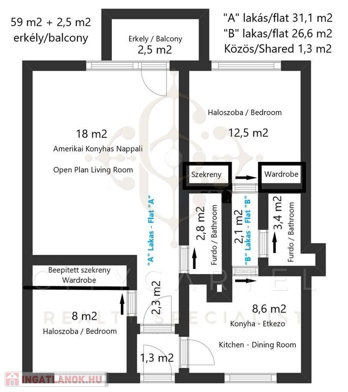 59 nm-es lakás + erkély