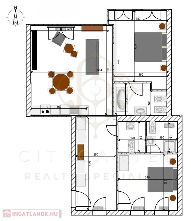 A tágas, amerikai konyhás nappali és a fő hálószoba a csendes utcára néz, míg a második hálószoba a nyugodt belső udvar intimitását élvezi. Mindkét háló saját fürdőszobával rendelkezik: a fő hálóhoz egy exkluzív, káddal, WC-vel és bidével felszerelt fürdő tartozik, a másodikhoz pedig egy modern, letisztult zuhanyzós megoldás. A külön vendég WC tovább növeli a lakás komfortját.