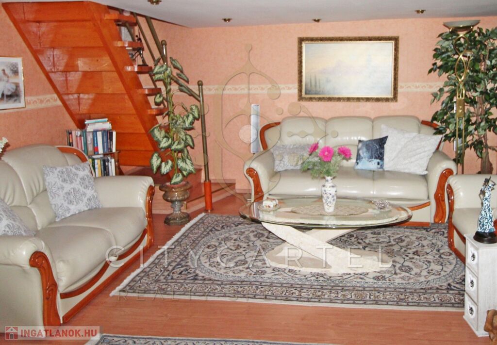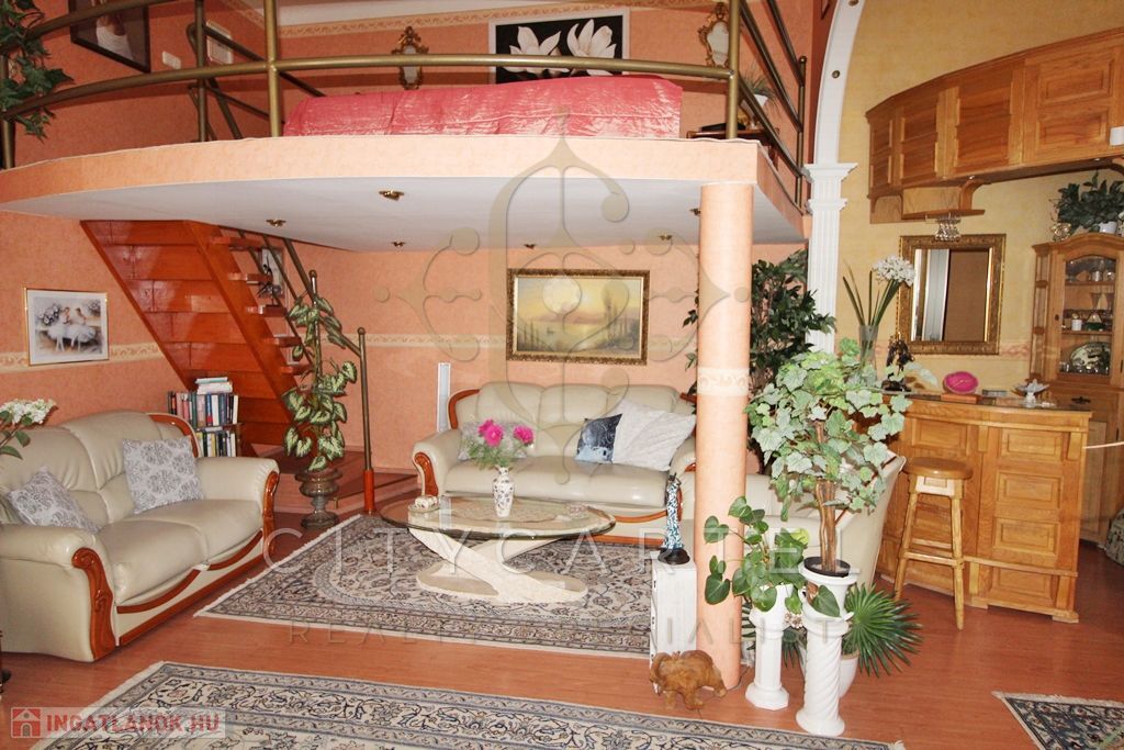 A kb. 34 nm-es, tágas nagy belmagasságú nappali galériázott, világos (kis bárpult rész is ki van benne alakítva), innen jutunk át a szintén galériázott, kb 13 nm-es hálószobába.