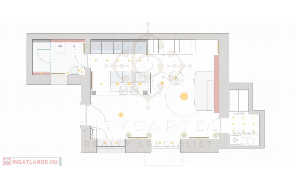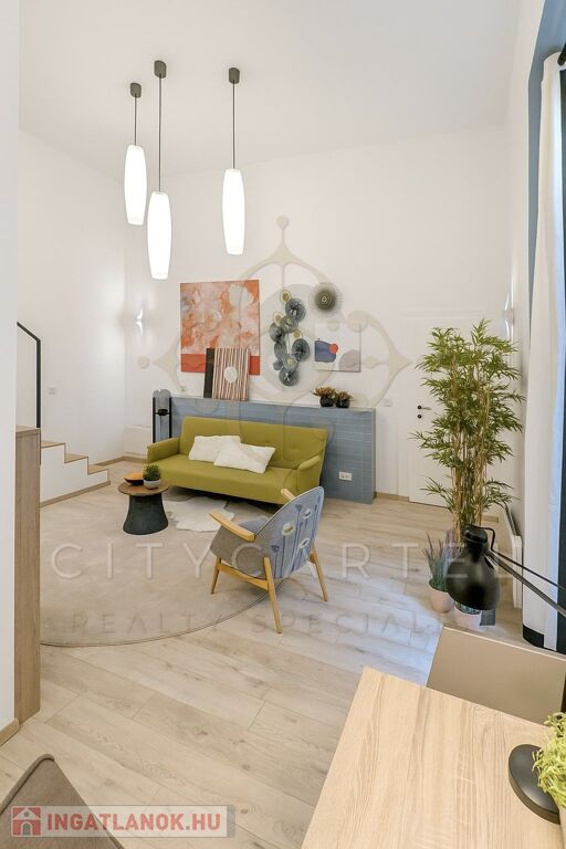 A 41 nm-es (plusz 8 nm galéria és 2 nm terasz) 1. emeleti lakás a belső udvarra néz, így rendkívül csendes, mégis néhány lépésre van a város lüktetésétől.