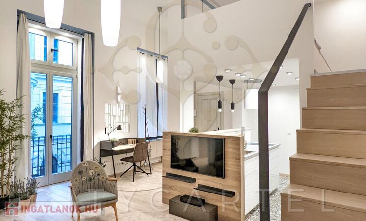 A 41 nm-es (plusz 8 nm galéria és 2 nm terasz) 1. emeleti lakás a belső udvarra néz, így rendkívül csendes, mégis néhány lépésre van a város lüktetésétől.