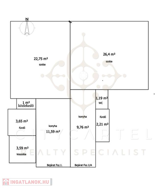 A bejáraton belépve a konyhába érkezünk, ahonnan jobbra található a fürdőszoba és a külön WC, míg szemben a tágas nagyszoba (26 nm) helyezkedik el, ahol fekvőgaléria is van.