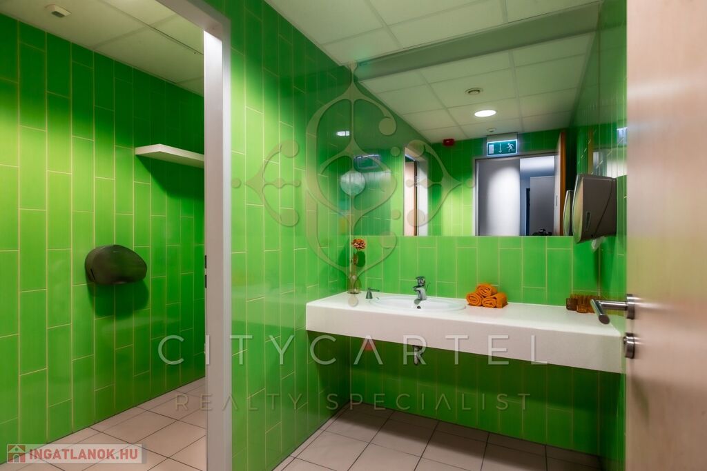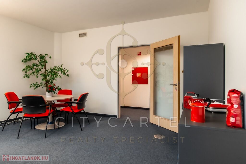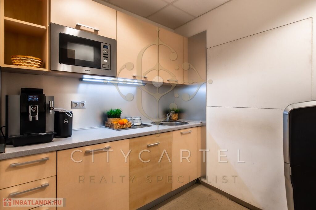 Ennek az irodarészlegnek a földszinten saját nagy konyhája és étkezője is van, aminek használatára minden bérlő jogosult.
