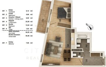 A liftes társasház 3. emeletén található, 55,49 nm-es, (54,25 nm lakás 7,95 nm terasszal) 3 szobás lakás korszerű hőszivattyús fűtés–hűtéssel és teljes körű okosotthon-rendszerrel felszerelve várja új tulajdonosát. A burkolatok még választhatók, így a leendő tulajdonos saját ízlésére szabhatja az ingatlant.